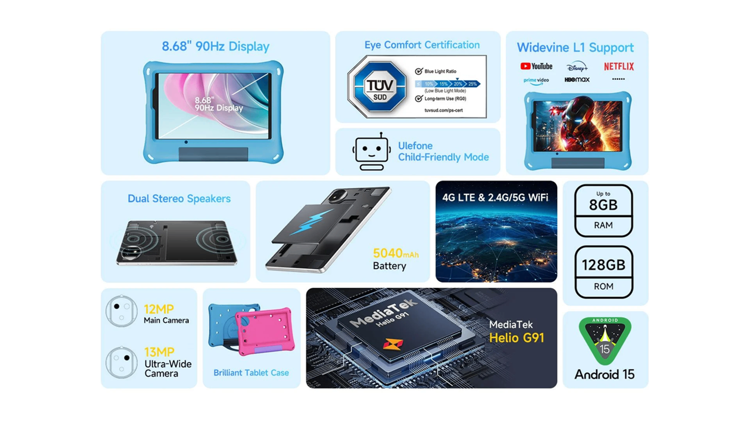 Ulefone A9 Pro Kids (2025) 2 Sim дэмжинэ TÜV SÜD нүдний хамгаалалтаар баталгаажсан буюу дэлгэцний цэнхэр туяаг бууруулах технологи ашигласан